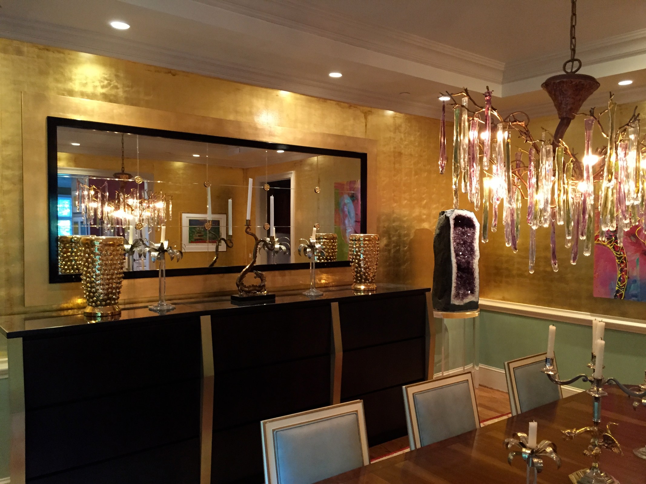Dining room renovation in Bethesda, MD. Directional recessed lighting used for various display pieces and custom chandelier over table.